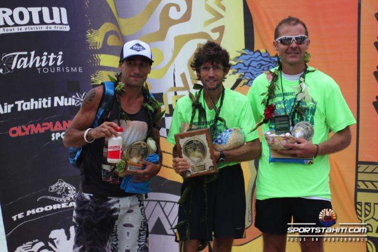 Au marathon, Jean Marc Carcy a pris sa revanche sur Teiva Izal en triomphant à Temae en 2H53’23. Teiva arrive en deuxième position en 3H04’35. Les deux hommes étaient côte à côte jusqu’au 25ème kilomètre mais Teiva Izal a eu coup de fatigue ce qui a permis à Jean Marc Carcy de tracer son chemin. C’est Olivier Chevalme qui complète le podium masculin en 3H13’25.